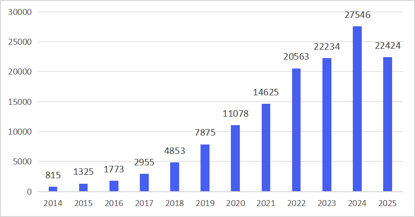 截至九月,全网共计收录引用Solarbio产品的文献达139547篇,总影响因子达795919.25,最高IF高达82.9。科研工作者对Solarbio品质的认可与信赖,充分体现在其文献引用数据的持续攀升中。下图展示了近十年以及2025年1月至9月期间,引用Solarbio产品的SCI文献数量的分布情况。